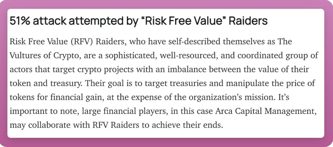 Aragon指责RFV突袭者和对冲基金Arca。他们声称RFV突袭者将自己描述为“加密货币的秃鹫”,据报道是一个成熟、资源充足和协调一致的团体。