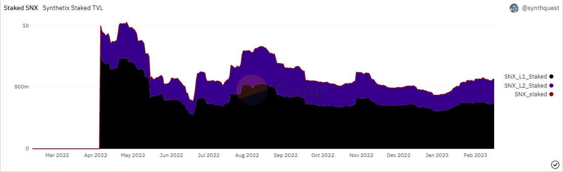 据Dune 数据显示,撰写本文时,SNX 总量为约 3.14 亿,L1 与 L2 总计的质押率约为 67.37%,而在 Curve 上提供流动性并可以进行原子交换的 sUSD、sETH、sBTC(包括 L1 和 L2)分别约有 3690 万枚、19180 枚、576.7 枚,按照撰写本文时的 SNX 以及比特币、以太坊价格计算,这些提供流动性的 sToken 总价值约为 8340.48 万美元,质押的 SNX 总价值约为 5.589 亿美元,可用于原子交换的 sToken 总价值不到质押 SNX 总价值的 15%。