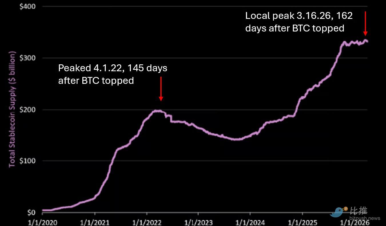 - 在 21 年周期中,稳定币供应量在 2022 年 4 月 1 日见顶(即 BTC 见顶近 5 个月后,且在持平 3 个多月后。USDC 直到 』22 年 7 月才见顶)。