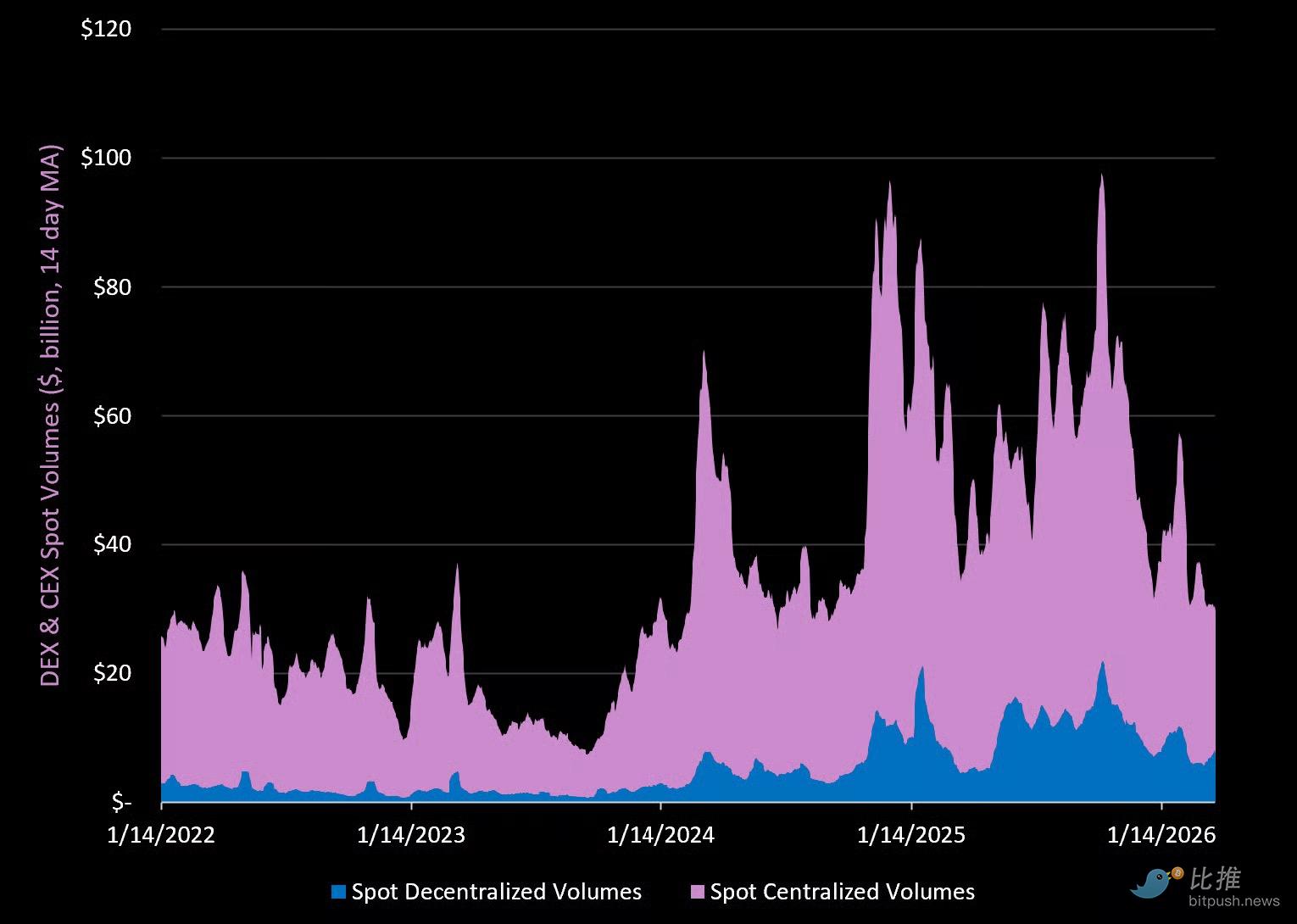 - 总现货成交量(DEX + CEX)目前较去年第四季度初的峰值下降了 70%。其中 CEX 成交量下降 71%,DEX 成交量下降 67%。
