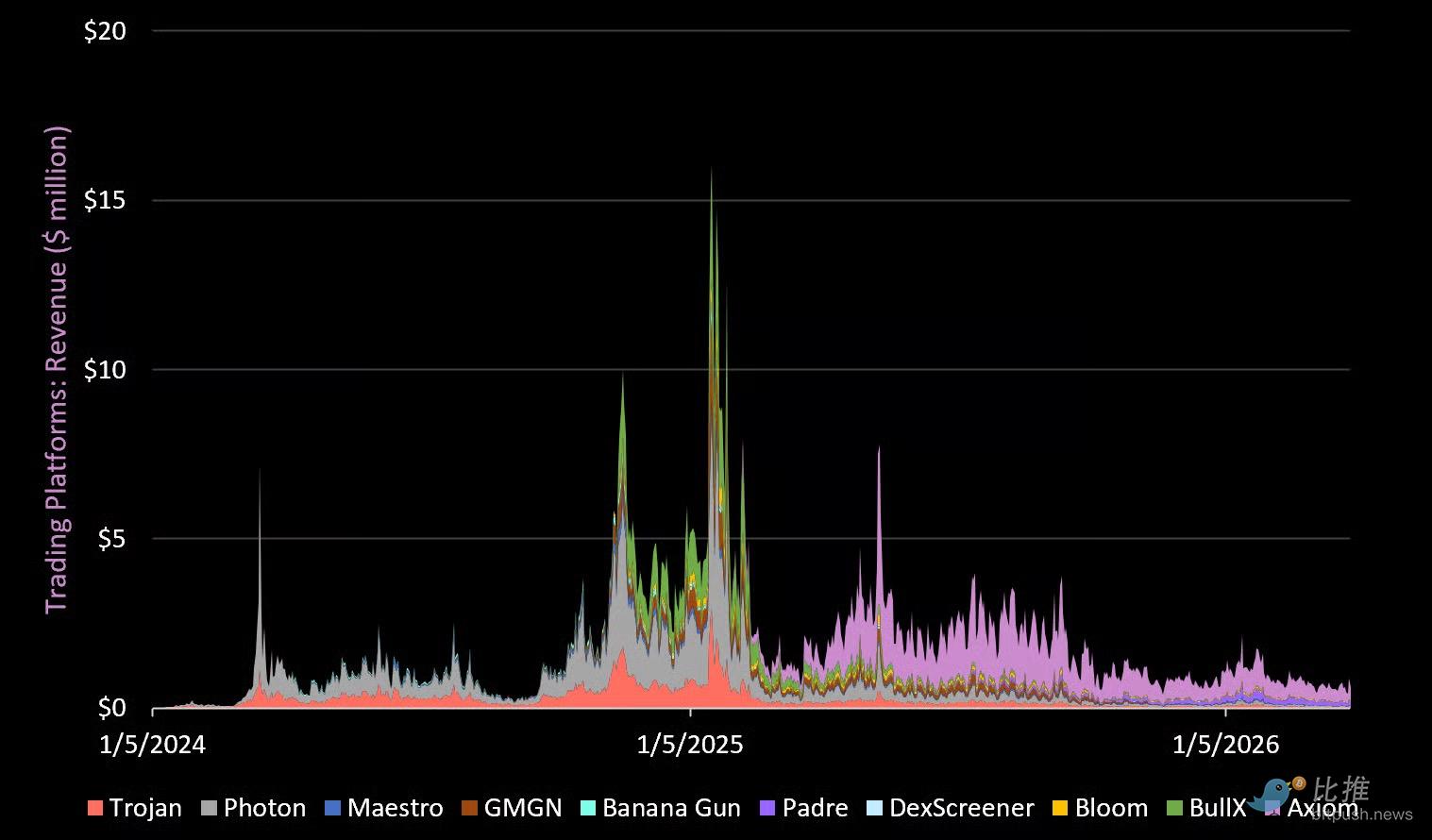 - Axiom(第一季度收入 3400 万美元)目前在该类别中拥有 68% 的市场份额。Padre(被 Pump Fun 收购)以 18% 位居第二。