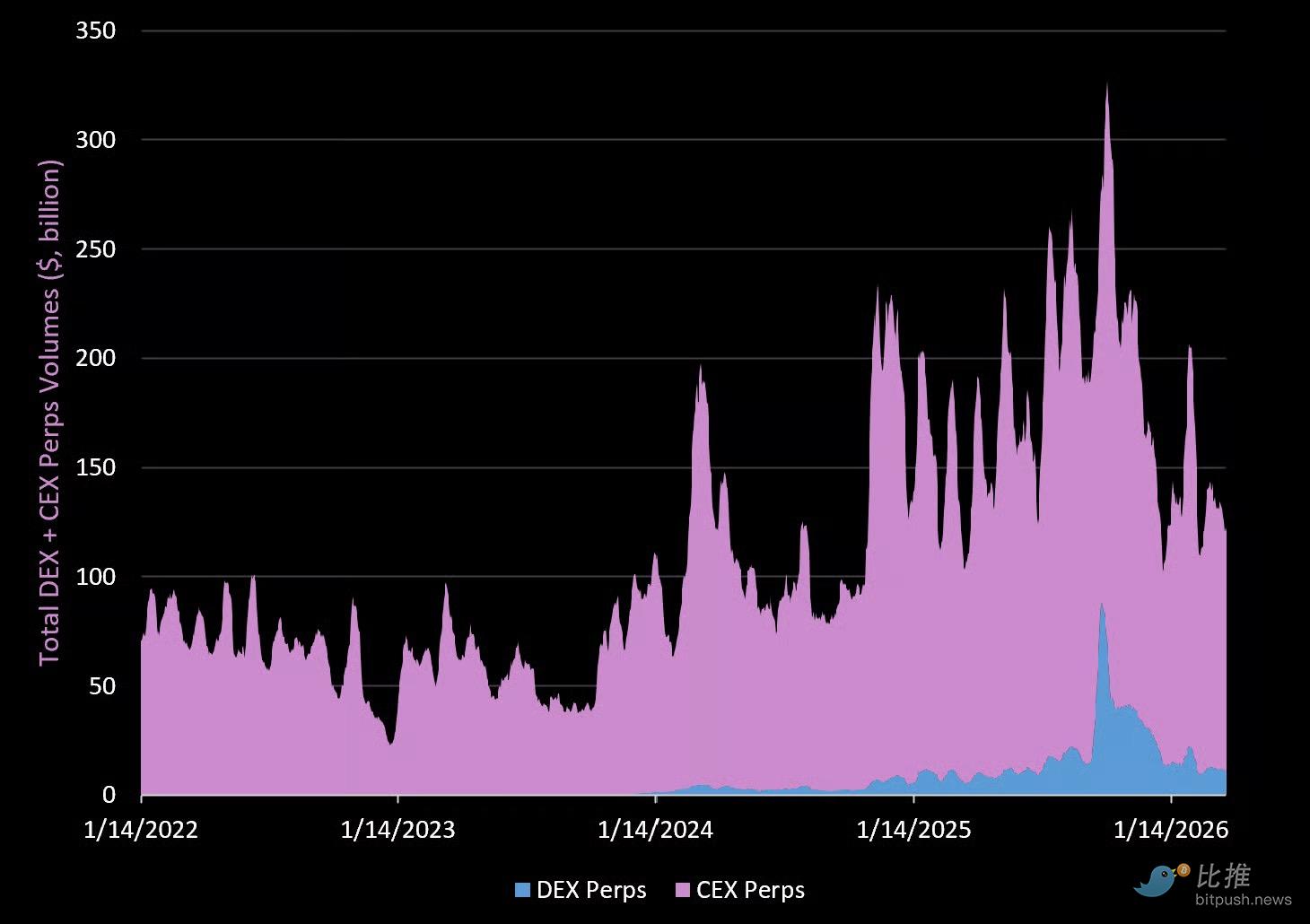 - DEX 永续合约成交量目前占 CEX 永续合约量的 9.3%,高于 2025 年初的 4%。