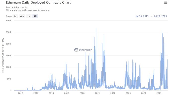 虽然以太坊合约部署量在2024年末和2025年初有所放缓,但近几个月来却出现了猛烈的发展热潮,今年多次出现每日新合约部署量突破20万个。尽管开发者已转向L2s,但以太坊L1仍然是一个充满活力的活动中心。