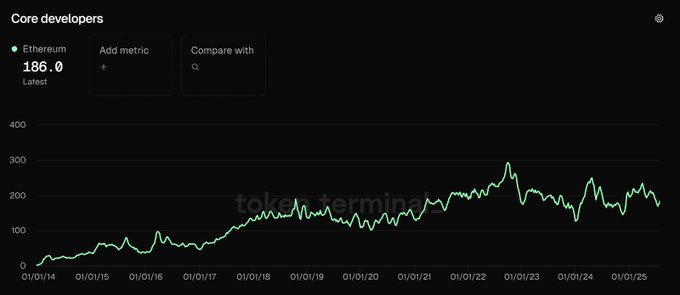 尽管活跃开发者数量低于上次牛市周期的峰值,但以太坊核心活跃开发者的数量(拥有186名独立贡献者)仍超过了所有其他加密项目。