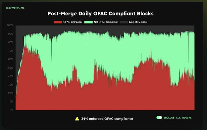 这些价值观延伸到区块构建方面,大多数区块构建者选择处理所有交易,无论地址或智能合约是否已被民族国家行为者标记为恶意。