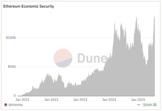 结合ETH爆炸性的价格走势,ETH质押的持续上升趋势使得以太坊的“经济安全性”——即验证者为保护网络而质押的ETH价值——达到了1400亿美元的历史新高。