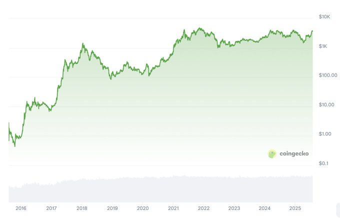 可以说是任何加密项目最受关注的成功指标就是其原生代币的价格。尽管以太坊曾多年来在与其他替代加密货币的竞争中表现挣扎,但自2025年5月以来,该代币强劲反弹,兑比特币升值75%。