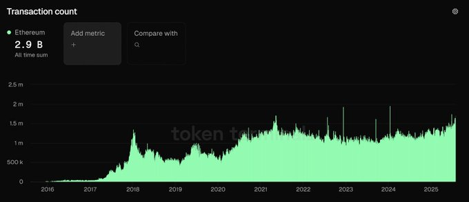 以太坊如今已走过十个年头。在主网持续产出区块整整十年后,2025年的链上数据显示其活跃度仍在爆发式增长!