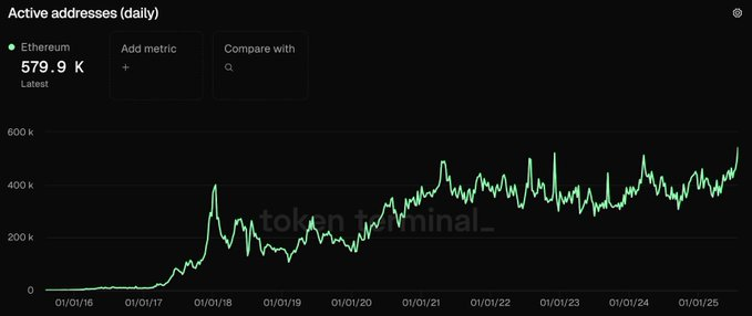 在过去的熊市中,日活跃地址数保持稳定,并且在整个2025年持续攀升,越来越多的用户转向以太坊L1,以获取世界领先的链上金融生态系统提供的独特属性。