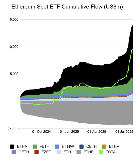 近几个月来,以太坊财库公司——包括由 Consensys 的 Joe Lubin 和华尔街的 Tom Lee 领导的公司——以巨大的价格超额表现抢走了比特币竞争对手的风头。同样,以太坊ETF的流入量在过去几周也急剧膨胀,每天吸引数亿美元资金,预示着以太坊热潮正席卷散户市场。