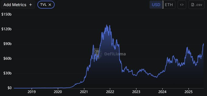 尽管上一次熊市中,随着加密货币价格暴跌,用户从应用中撤出或迁移到竞争链,以太坊的TVL遭受重创,但自今年4月以来,这一数据一直在爆炸式增长,已创下超过880亿美元的新周期高点,并正积极追逐新的历史最高纪录。