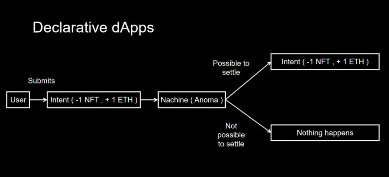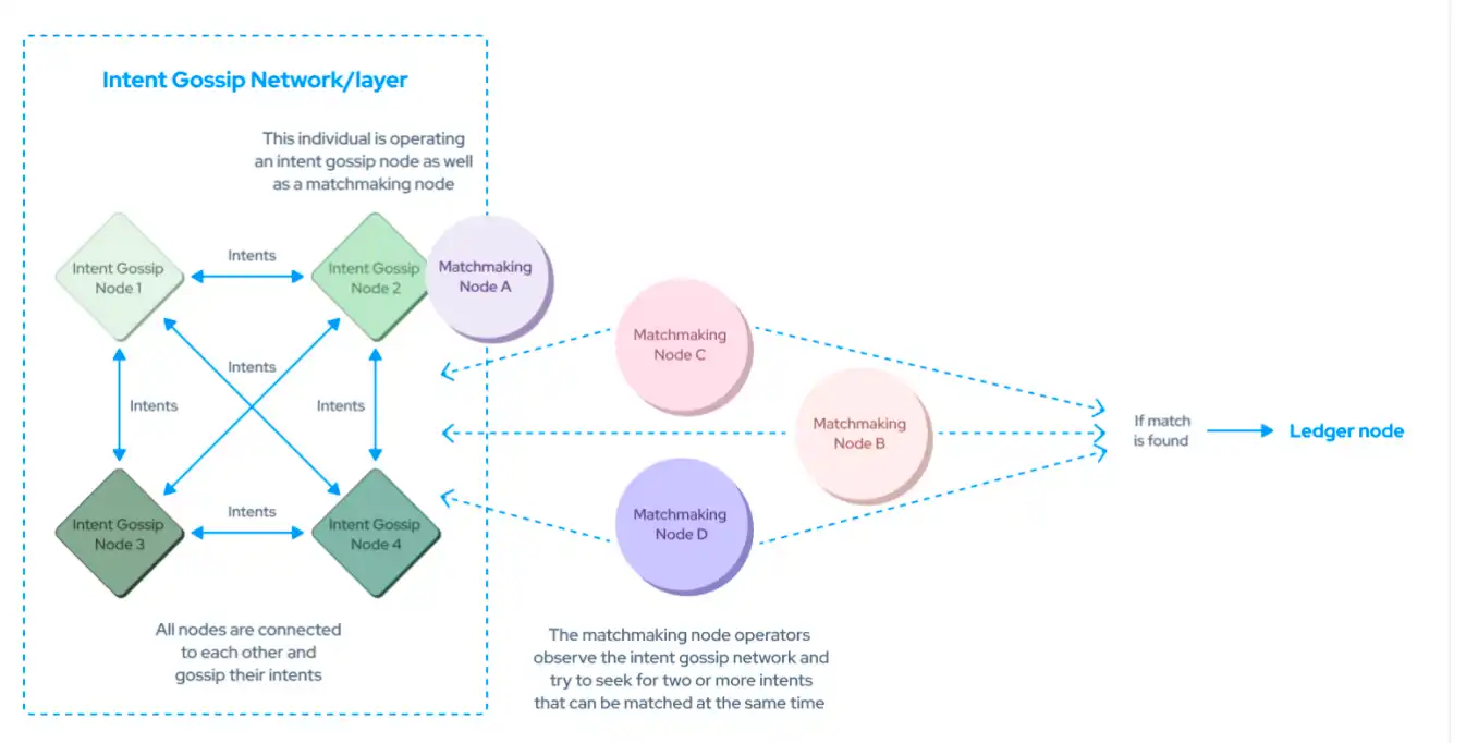 在以太坊 EVM 中,交易并不强制要求未来状态而是授权具体执行路径,而 Anoma 包含一个匹配系统,允许用户使用 Gossip 广播交易意图。简单来讲 Anoma 由两个主要部分组成:分布式账本和意图匹配系统,它们相互补充也可以单独运行,通过使用 Intent Gossip 运行节点、Token 交换求解器和请求新意图的 RPC 服务器,并将交易从匹配的意图提交到分布式账本中,从而帮助用户自动发现交易对手;
