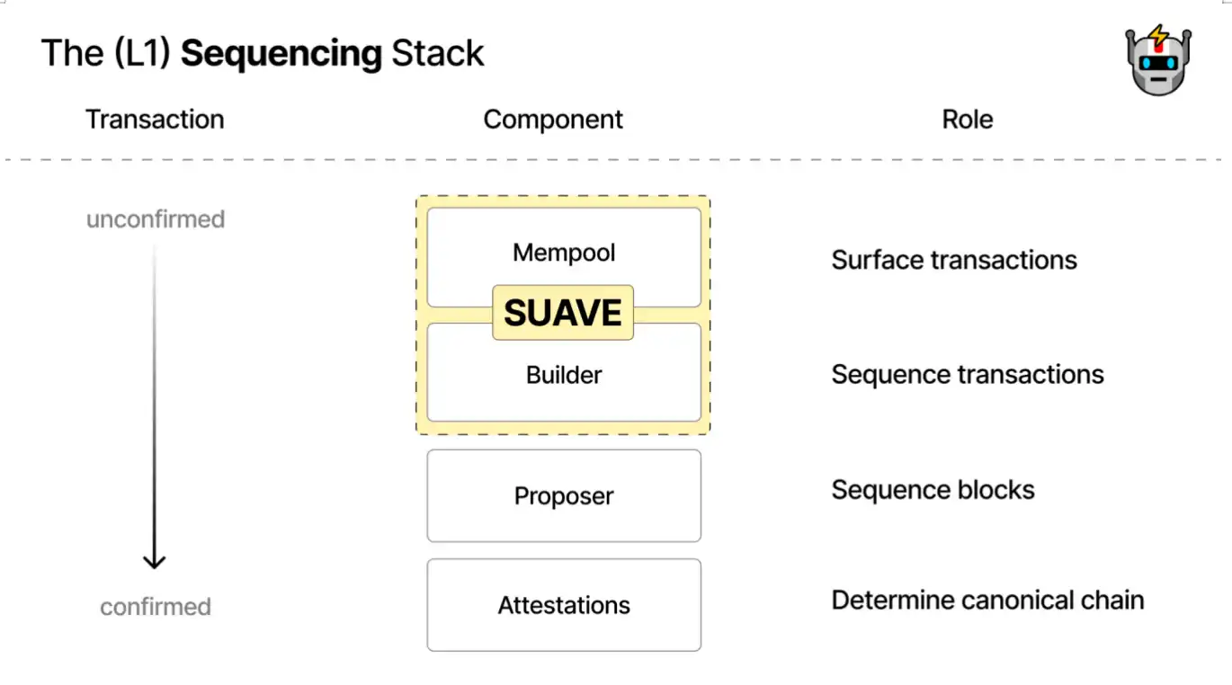 据 23 年 7 月 25 日消息,以太坊基础设施服务 Flashbots 以 10 亿美元估值完成 6000 万美元 B 轮融资用于开发 SUAVE 平台。SUAVE(Single Unified Auction for Value Expression)将内存池和区块生成从现有区块链分离从而形成一层独立区块链网络(排序层),并提供高度专业化的即插即用替代方案【4】,旨在解决 MEV 相关挑战的基础设施。