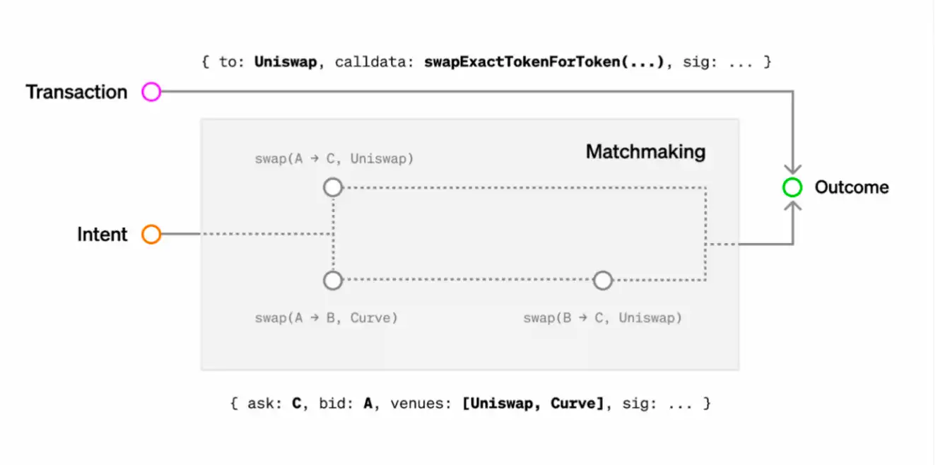 简而言之:交易 = 我指定执行方式这样做;意图 = 我只要这样的结果但不关注实现的过程。不同偏好的意图可以通过复杂的方式进行匹配,而实现这一过程需要「发现交易对手」和「求解器的求解」。