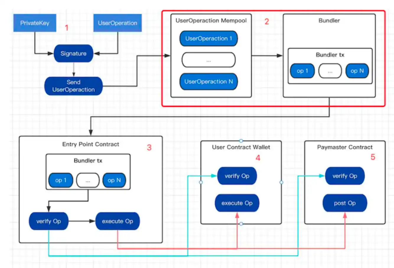 ● 将操作发送到 P2P「用户操作内存池(UserOperation Mempool)」并由捆绑器对执行的签名,Gas 费用等用户操作交易内容进行「捆绑打包」提交上链(实际包含多种情况这里不做展开);