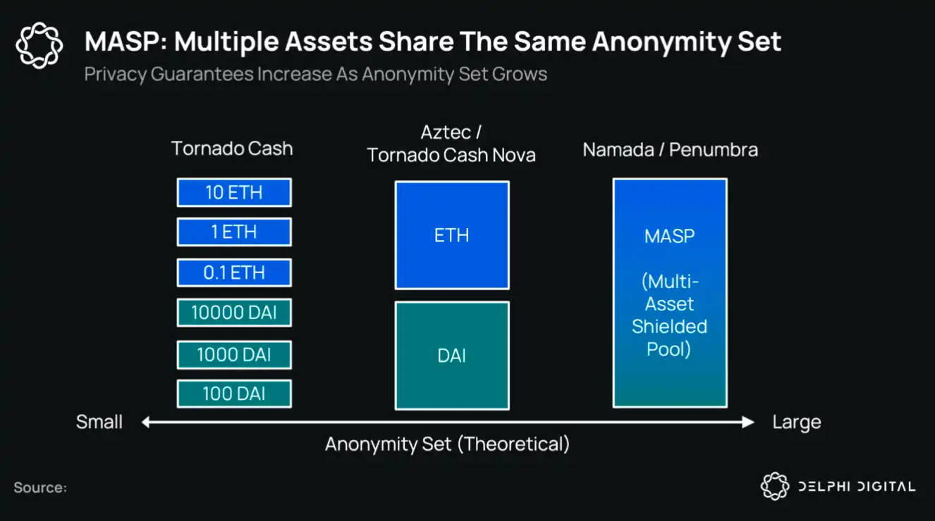 为了保护用户隐私并防止他人追溯收集数据,发送方、接收方、金额和资产面额都经过加密,通过零知识证明 zk-SNARKs 来保证资金的转移,它的独到之处是允许所有资产共享同一个屏蔽池(MASP)来提供可组合的资产保护增加用户匿名集,而不是每个资产单独屏蔽。参与者越多资产越多转移就更加频繁,这大幅增加了资产转移数据的隐匿程度;