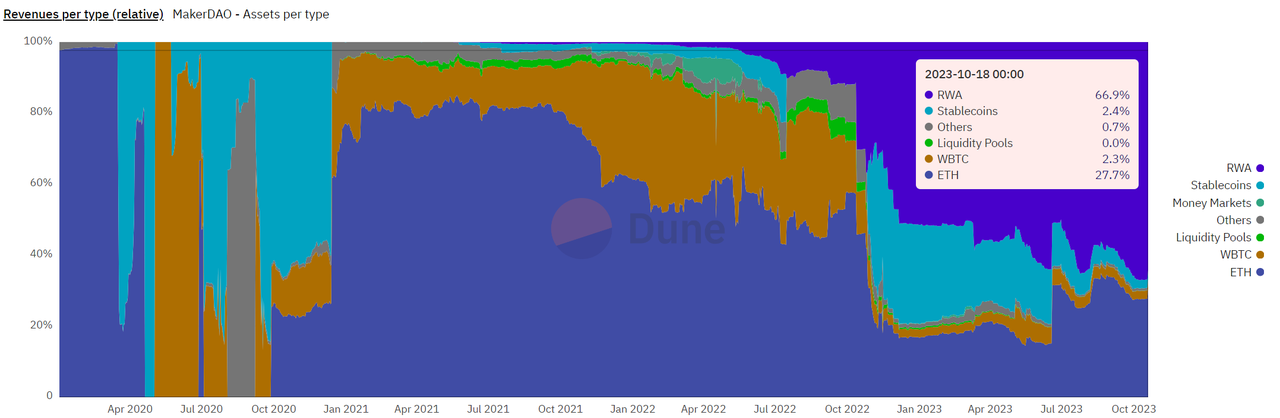 MakerDao目前是RWA领域的领军者,同时也是TVL排名第二的Defi项目。其RWA业务的TVL已达到32亿美元,今年的增长率高达400%。今年三月,创始人RuneKek提出了"Endgame"计划,旨在通过投资真实世界资产和货币市场基金来增加平台收入。目前,46%的$DAI都是由RWA作为储备资产,而Maker DAO的协议收益中,有66.9%来自RWA。