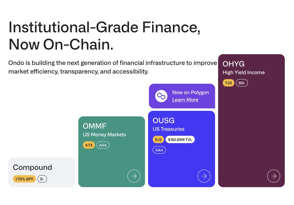 Ondo Finance是市值排名第一的代币化证券Defi协议。其投资于美国货币市场的OMMF年化报酬达到4.7%,而美国国债OUSG的收益可达5.5%。