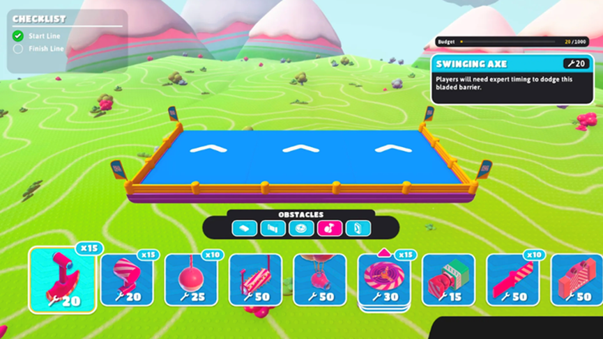 此次更新添加了一个级别编辑器,供玩家构建回合。在竞速模式中,只需要一个起点和终点线,而障碍物可以选择不同的点数,最多为1000点。Mediatonic使用相同的编辑器提供了20个由内部创作的回合,以激发创作者的灵感,尽管目前还没有可用的框架或预设。Mediatonic挑选出的顶级创意回合可以在主屏幕上的创作者播放列表中展示,但目前没有算法发现的功能。