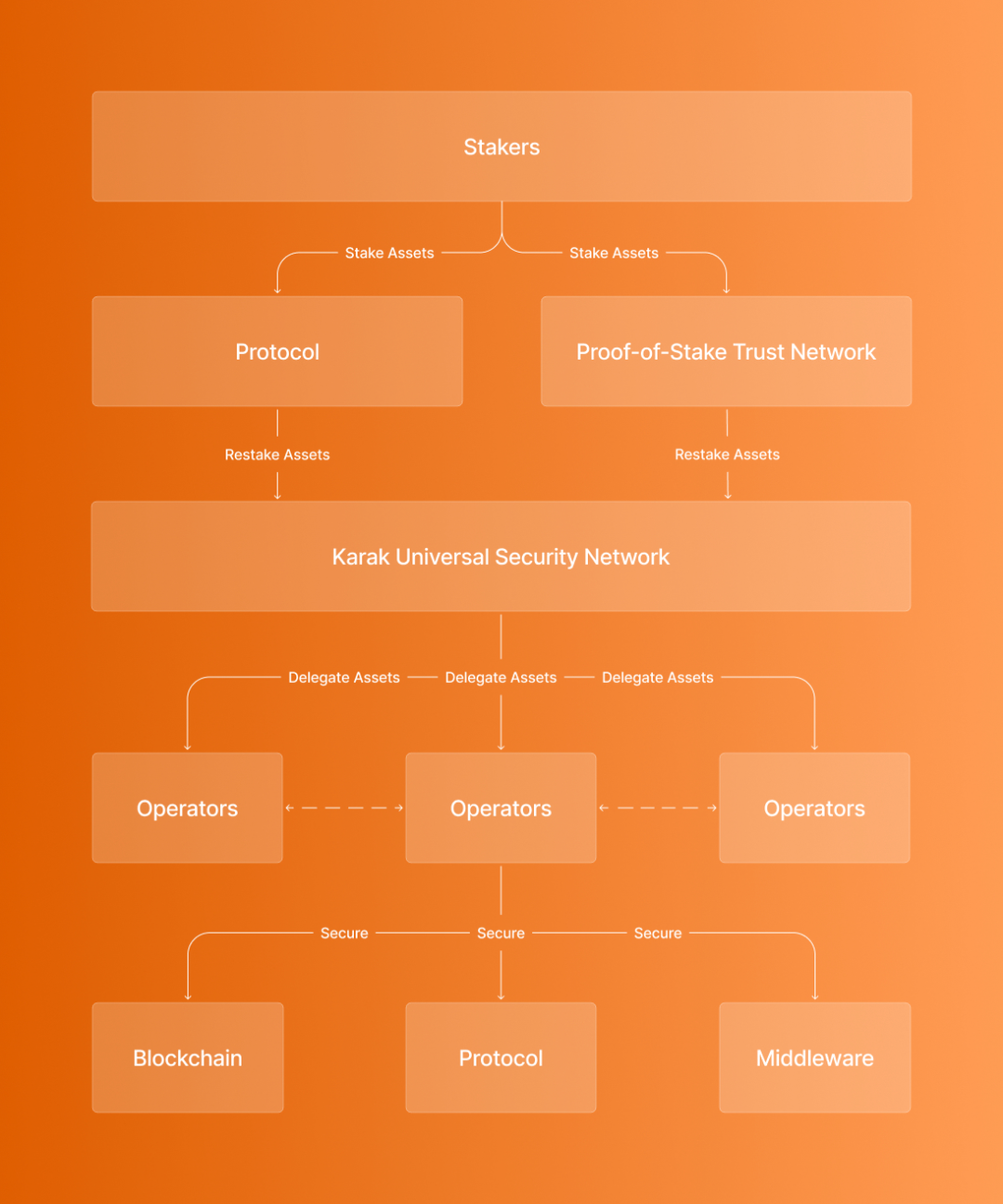 - 对验证者来说,已质押的资产被分配给 Karak 网络上的分布式安全服务验证者 (DSS),并授予对其质押资产的额外执行权。
