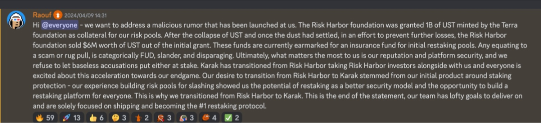- 二是Karak团队前项目的“自保行为”遭到社区批评,更有 KOL 直指其为 RUG。针对这一质疑,团队在4月9日的 DC 中进行了回应。