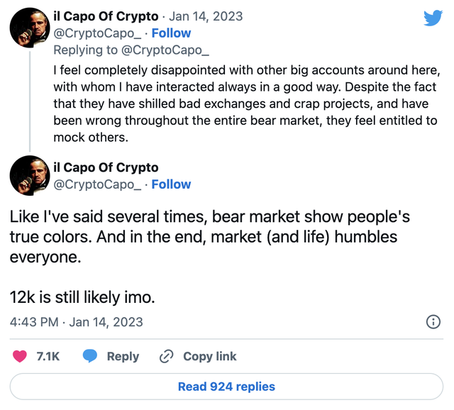 市场上的其他一些专家也表达了同样的看法。 il Capo Of Crypto 是一位著名的加密货币分析师和摇摆交易员,其 Twitter 用户名为 CryptoCapo,他坚持自己的观点,认为比特币有可能回到 12,000 美元的水平。