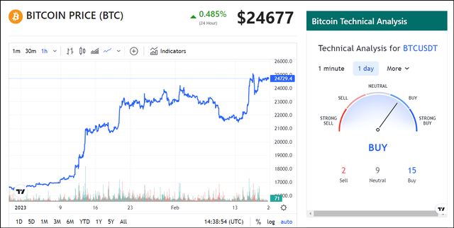 此外,应该注意的是,BTC在CoinGape的加密货币市场追踪器的技术分析(TA)指标建议了一个买入机会,正如移动平均线所总结的那样,移动平均线建议在15级 “买入”,在2级“卖出”。从目前的情况来看,比特币(BTC)的价格目前在24,677美元,这意味着在过去24小时内增长了0.65%,而在过去7天内则增长了13%。