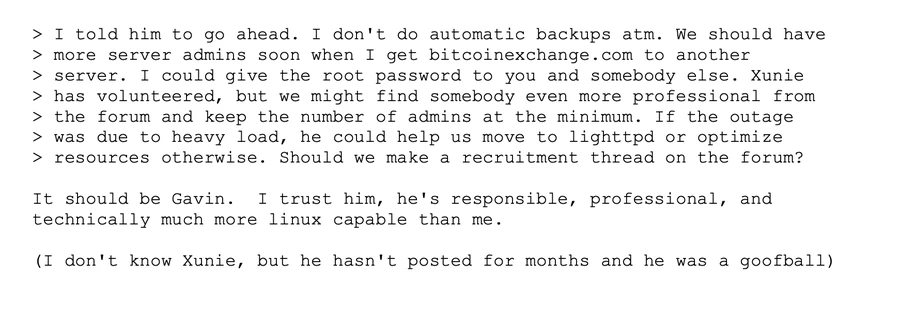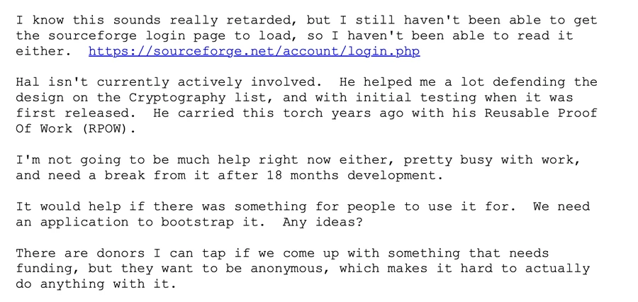原文:“Hal 在密码学论坛上帮助我很多,对设计进行了辩护,但目前并不活跃参与其中。他在比特币最初发布时为其进行了初步测试。他多年前曾用他的可重用工作证明(RPOW)为这个领域贡献了很多。我现在也无法提供太多帮助,工作很忙,经过 18 个月的开发后,我需要休息一下。”