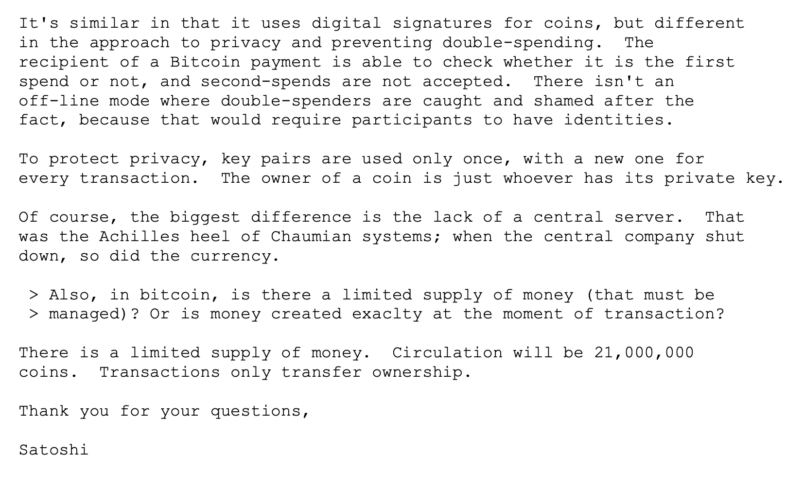 原文为“DigiCash 类似于使用数字签名来代表货币,但在隐私保护和防止双重支付方面有所不同。比特币支付的接收方能够检查是否为首次支付,如果不是,则不接受二次支付。不存在后期捕获和公开双重支付者的离线模式,因为这将要求参与者具有身份。为了保护隐私,密钥对仅被使用一次,在每次交易中都会生成新的密钥对。货币的所有者就是持有其私钥的人。当然,最大的区别在于没有中央服务器。这是 Chaumian 系统的致命弱点,当中央公司关闭时,货币也会随之关闭。在比特币中,货币的供应是有限的。总量将是 21, 000, 000 个硬币。交易只是转移所有权。”