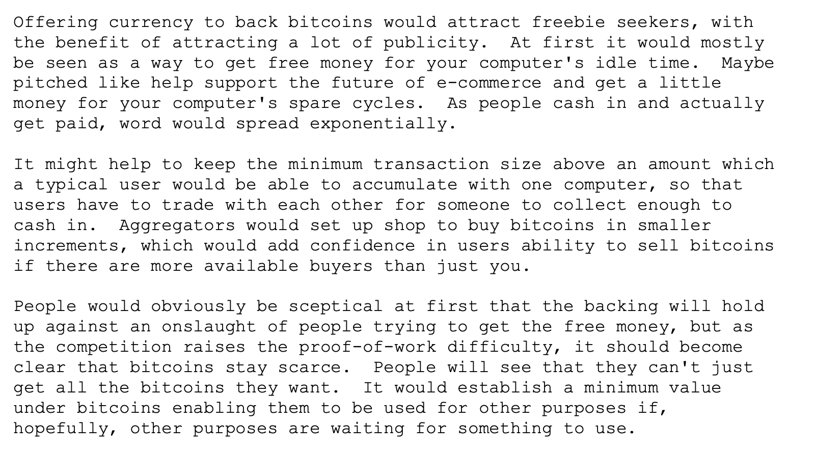 原文:“提供货币来支持比特币将吸引免费的寻求者,这将带来很多宣传效益。起初,它主要会被视为一种让计算机的闲置时间获得免费货币的方式。也许可以宣传为帮助支持电子商务的未来,并在计算机空闲周期中获得一些收入。随着人们兑现并实际获得报酬,消息将呈指数级传播。可能有助于将最小交易金额保持在一个典型用户能够累积的金额以上,以便用户必须相互交易,才能收集足够的金额兑现。聚合商(当初交易所的雏形)将设立小额兑换店铺,这将增加用户兑换比特币的信心,有更多的买家可供选择。起初,人们对免费获取货币持怀疑态度,但随着竞争提高工作证明的难度,比特币的稀缺性应该会变得明显。人们会意识到他们不能随意获得所有他们想要的比特币。这将确立比特币的最低价值,使其能够用于其他目的,如果有希望,其他目的正在等待使用。”