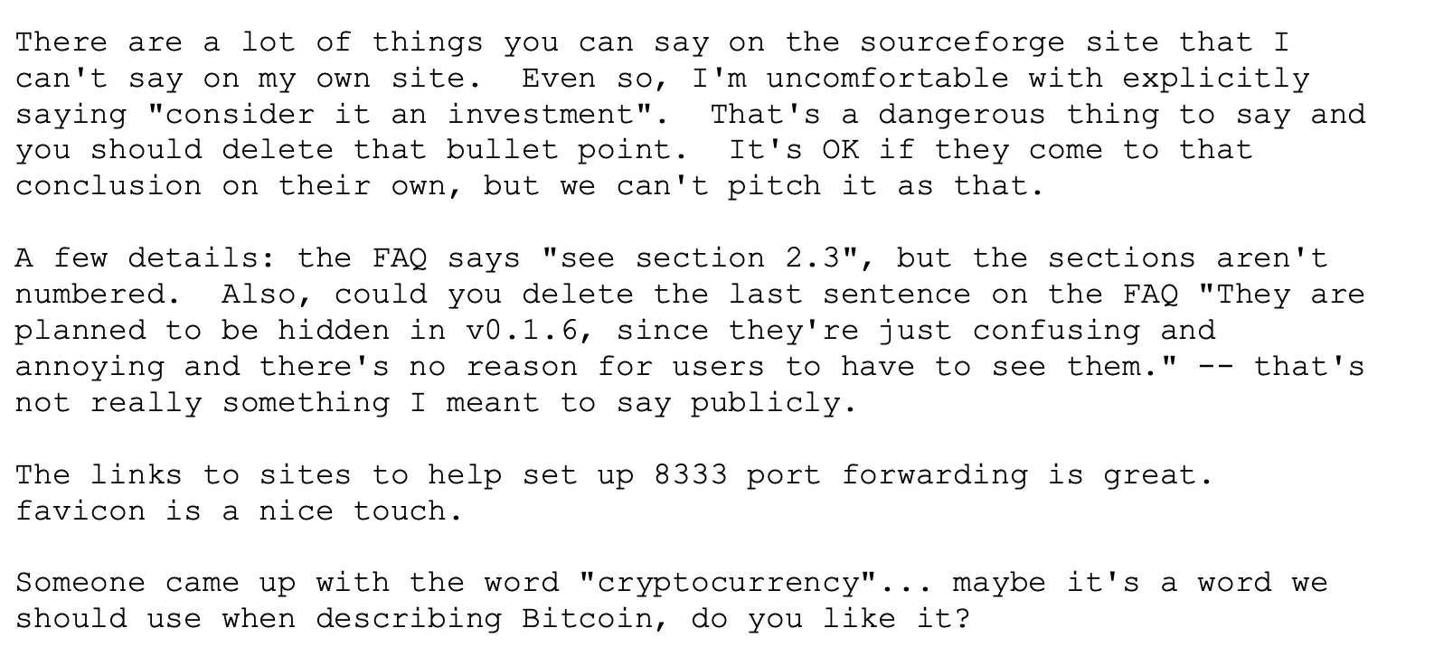原文:“有很多你可以在 SourceForge 网站上说的事情,而我自己的网站上不能说。即便如此,我对明确地说‘考虑它作为一种投资’感到不舒服。这是一个危险的说法,你应该删除这个项目。如果他们自己得出这个结论,那就没问题,但我们不能把它当做这样来推销;有人提出了‘加密货币’这个词,也许我们在描述比特币时应该使用这个词,你觉得呢?”