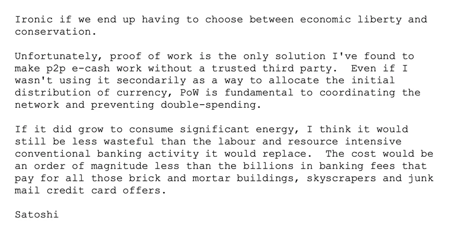 原文为“讽刺的是,我们最终可能不得不在经济自由和环境保护之间做出选择。不幸的是,我所找到的唯一解决方案是工作证明(POW),工作证明对于协调网络和防止双重支付至关重要。工作证明是使点对点电子现金系统能够工作且无需信任第三方的关键。