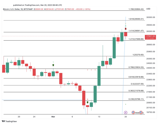 然而,比特币在过去24小时内面临部分回调,目前交易价格为27,891美元,市值为5380亿美元。尽管市场乐观主义者预计BTC价格很快就会触及30,000美元,但下一步行动可能取决于3月21日(星期二)的美联储会议。