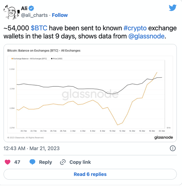 另一方面,在过去一周左右,交易所的比特币供应量大幅上升。这可能意味着BTC未来可能面临的卖压。