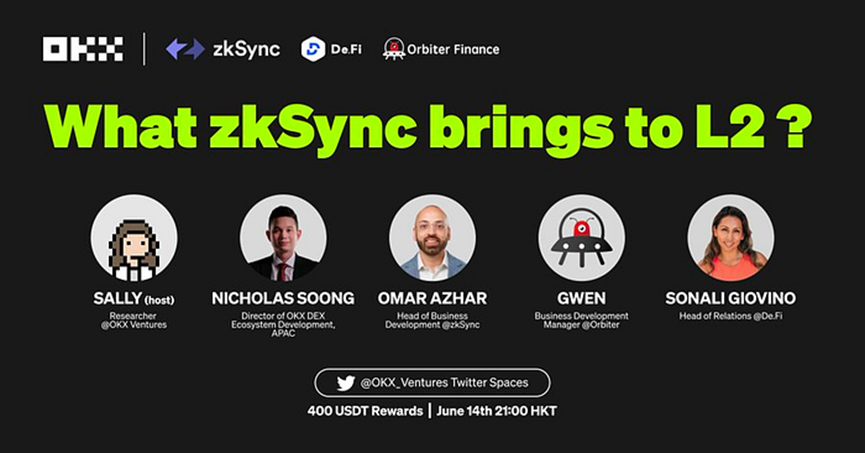 6月14日,OKX Ventures在Twitter上举办了一个关于“zkSync对L2的贡献”的讨论。讨论由OKX Ventures的研究员Sally Gu主持,与OKX DEX生态发展亚太区总监Nicholas Soong、zksync的业务发展负责人Omar Azhar、Orbiter的业务发展经理Gwen和De.Fi的关系主管Sonali Giovino一起讨论了zk技术和生态系统的发展以及他们自己产品的里程碑。