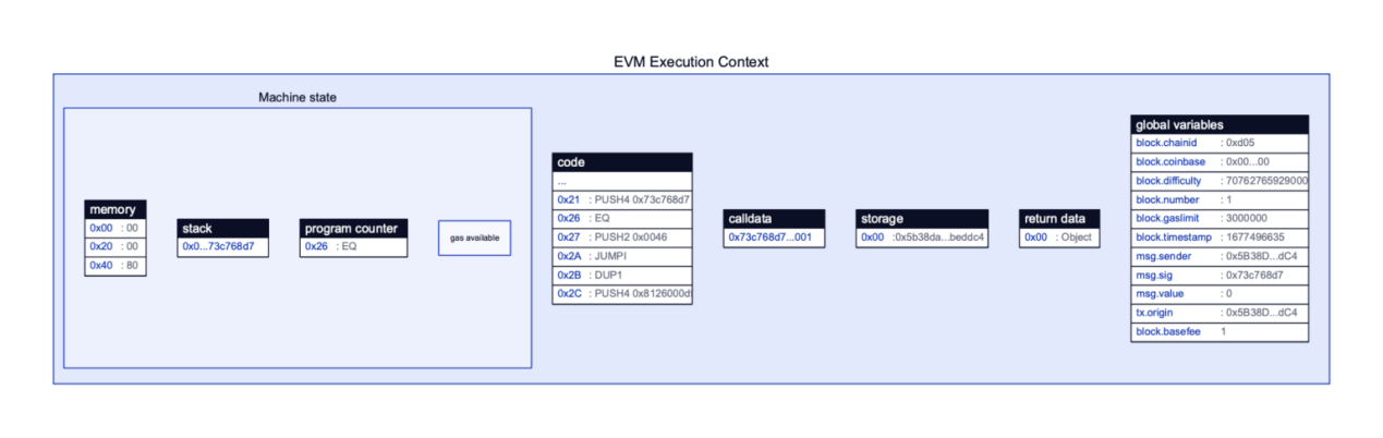 智能合约的执行发生在以太坊网络验证者的EVM实例内。当智能合约开始执行时,EVM会创建一个执行上下文,其中包含如下所述的各种数据结构和状态变量。执行完成后,执行上下文被丢弃,为下一个合约做好准备。以下是EVM执行上下文的高级概述: