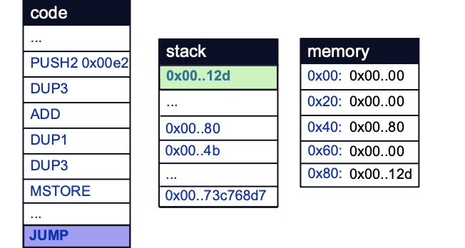 这个缺陷背后的一般想法是,Pointer结构在内存中本质上起到一种“基础”功能,可以从中添加偏移量。通过指定特定偏移量,该结构的fwd()函数可以用作各种jumpdest的跳板,其中一些将属于在高级Solidity中通过传统控制流程被防止执行的函数逻辑。要了解更多关于字节码执行期间如何引用内存的信息,请重新查看EVM调用上下文的内存部分。