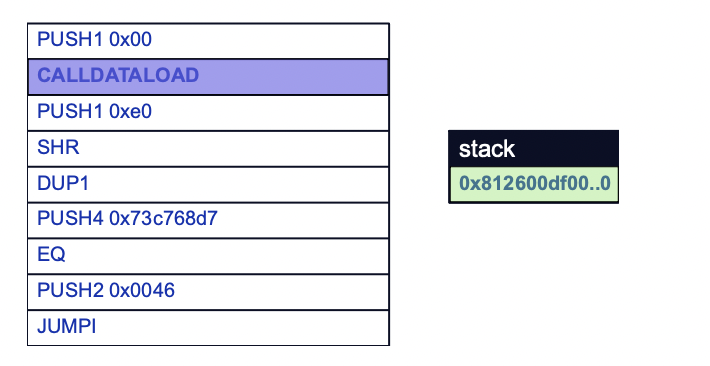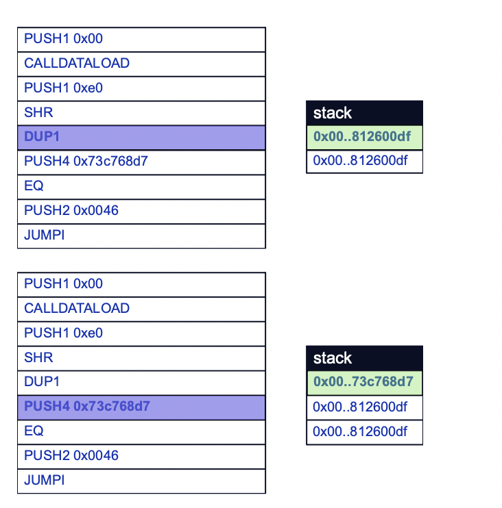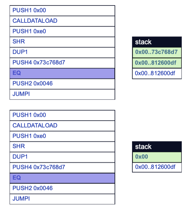 在这里,由于0x812600df和0x73c768d7不匹配,0值将被推到堆栈中。请注意,从我们的calldata推导出的原始函数选择器仍然保留在比较结果下面,准备最终与下一个函数选择器进行比较: