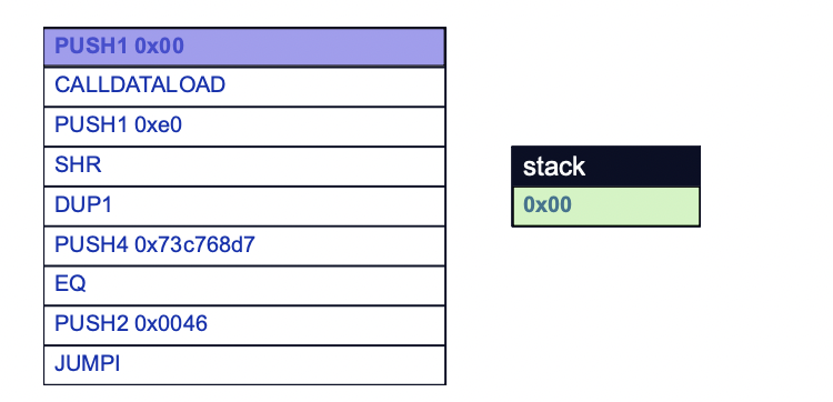 首先,PUSH1操作码将0x00的值推送到堆栈上。这个值将作为下一个操作码CALLDATALOAD的偏移量: