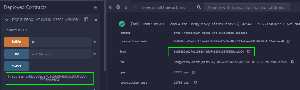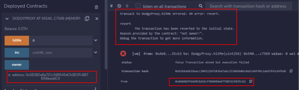 当以合约所有者以外的任何账户执行hitMe()函数时,由于自定义的onlyOwner修饰符,如果所有者状态变量没有设置为调用者的地址(msg.sender),则不可能从hitMe()直接调用私有 deleg()函数,因为该修饰符会防止私有函数逻辑被执行。