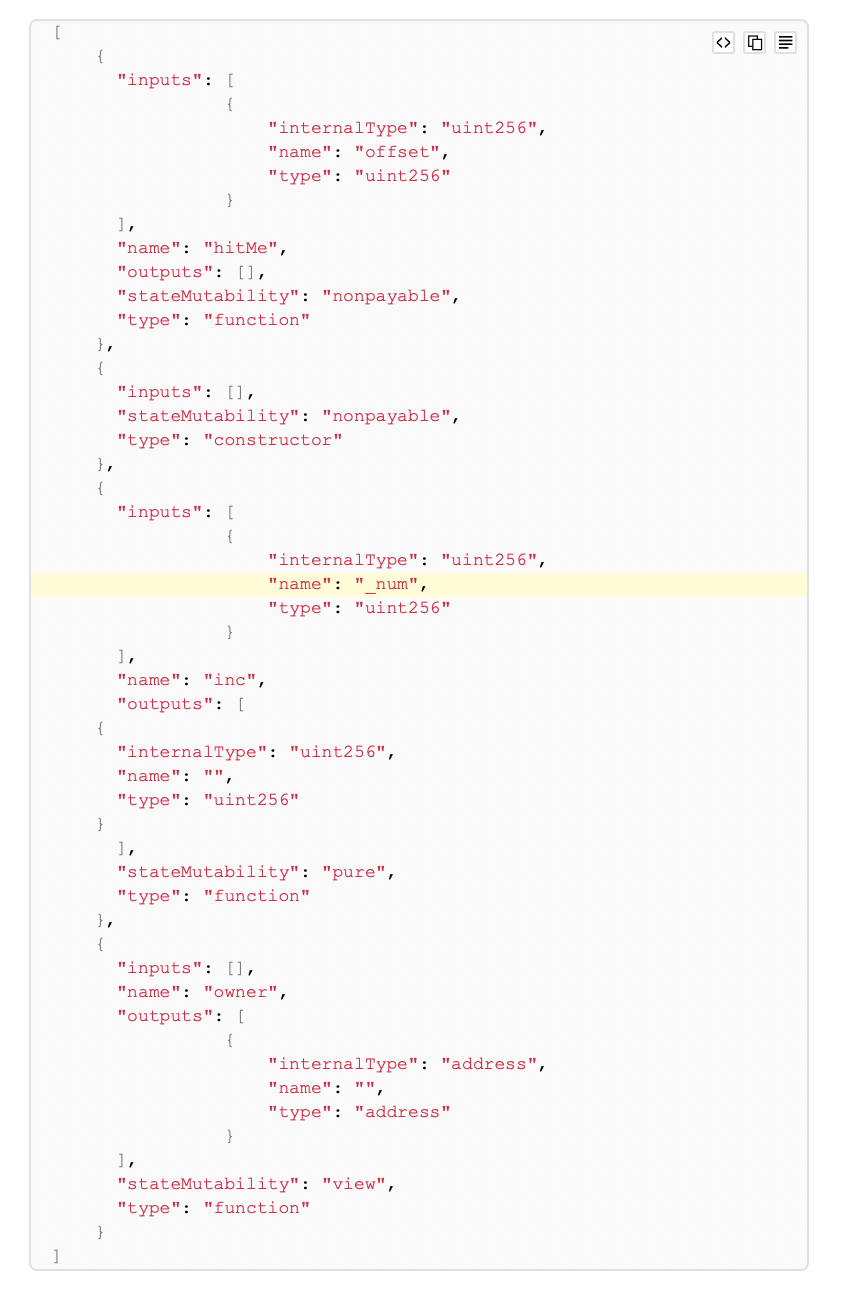- inputs:一个对象数组,它们本身定义了参数名称和类型。请注意,这里定义了types和internalTypes。这是因为在Solidity和ABI中,某些数据类型的引用方式存在微妙的差异。例如,在solididity中,struct类型的输入将有一个内部类型为tuple。