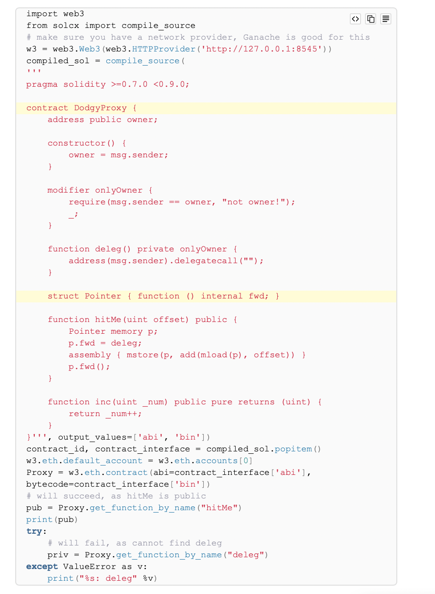 还应该注意的是,公共状态变量也被赋予了它们自己的选择器,并被编译器视为getter。例如,一个名为owner的公共状态变量将有一个选择器被公开为keccak256(“owner()”)=0x8da5cb5b。它可以从其他以DodgyProxy.owner()方式导入DodgyProxy的合约中访问。