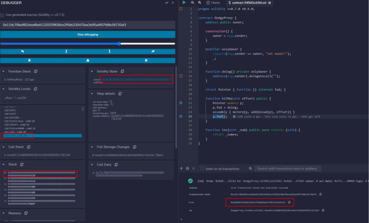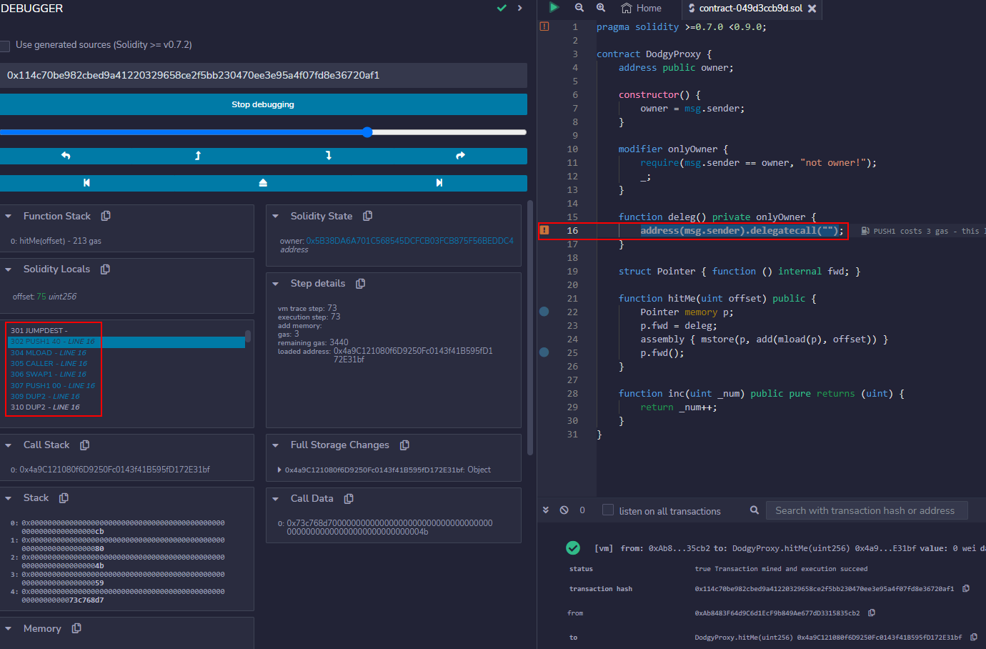 我们可以通过在delegatecall所在行设置一个断点并调用参数为75的hitMe()函数来确认delegatecall是否已经到达。执行将继续进行到delegatecall: