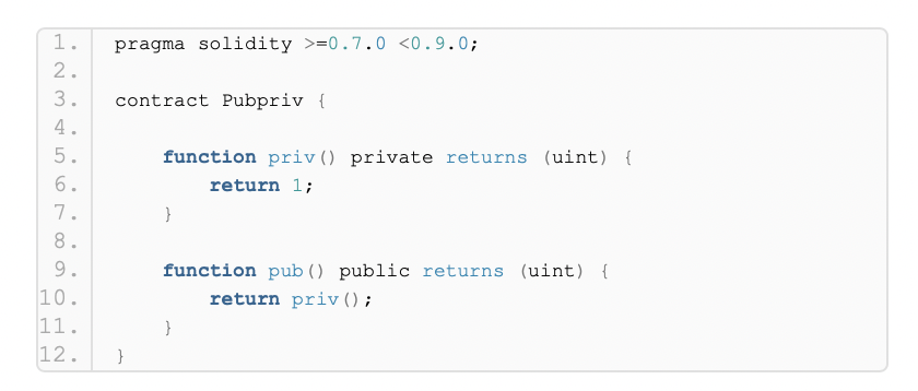 目前,以下合约是有效的Solidity,尽管有些冗余。公共函数可以调用同一合约中的私有函数,并处理任何结果,而不会出现问题: