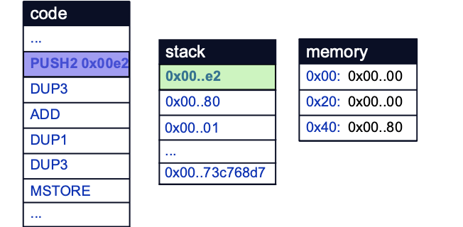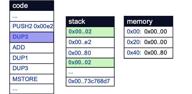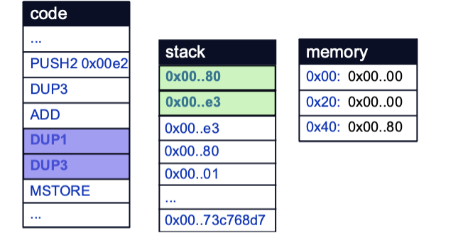 然后堆栈上的最后两个参数被DUP1和DUP3操作码复制,为MSTORE操作码将值0xE3存储在内存位置0x80处做准备: