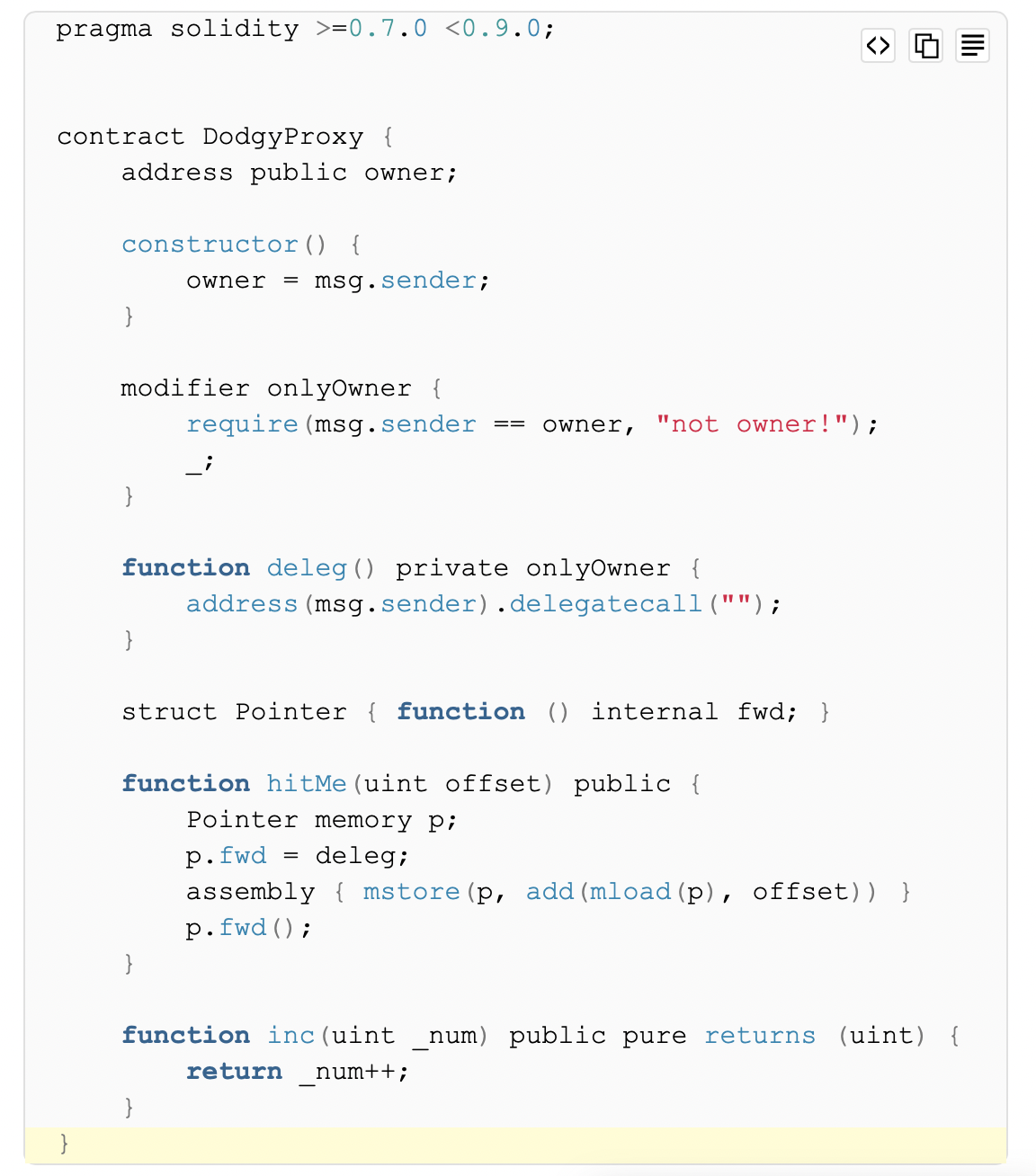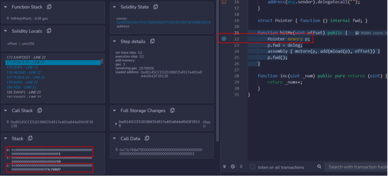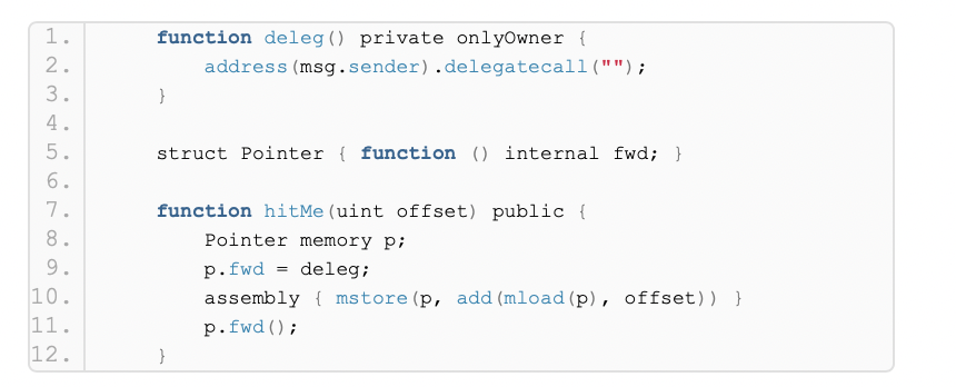 然而,我们在汇编块中引入了某种不太明显的内存损坏漏洞。如果给到hitMe()函数正确的输入,尽管deleg()函数由于onlyOwner修改器而无法访问,并且由于私有函数可见性而受到了外部调用的限制,仍然有可能在deleg()函数的中间位置结束并恢复执行。