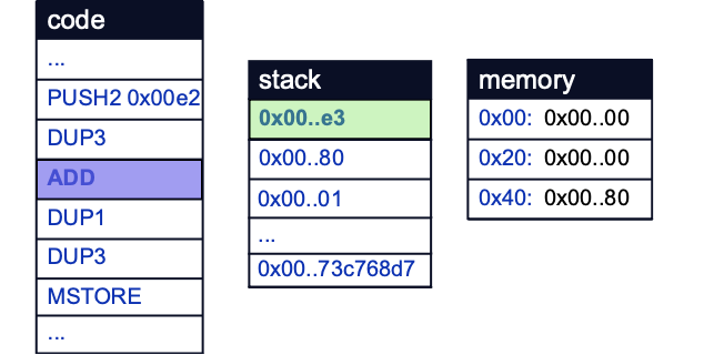 然后ADD操作码将0x01添加到0xE2,并将0xE3存储在堆栈上。注意,由于编译器的优化和Yul的翻译,从编译器生成的字节码将与准确的汇编略有不同: