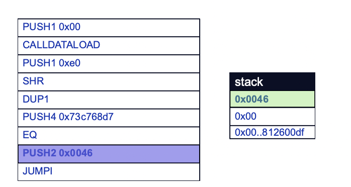 然而,EVM目前仍然需要进行另一次比较,以决定是否跳转到函数选择器对应的函数逻辑,然后才能开始比较下一个函数选择器。这种比较是通过首先使用PUSH2操作码将一个偏移量推到堆栈中函数逻辑的起始位置来完成的。