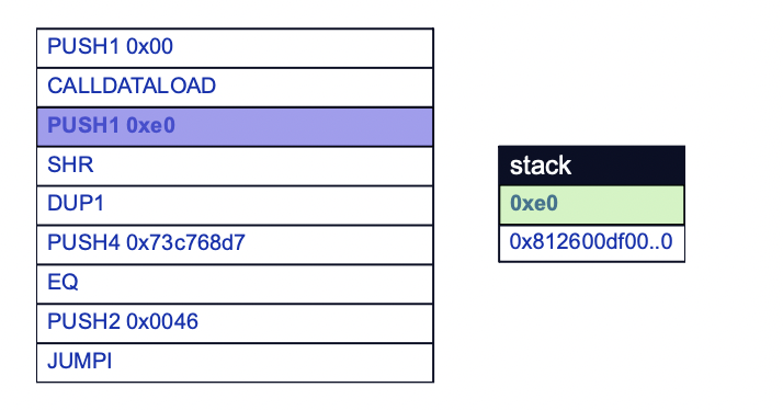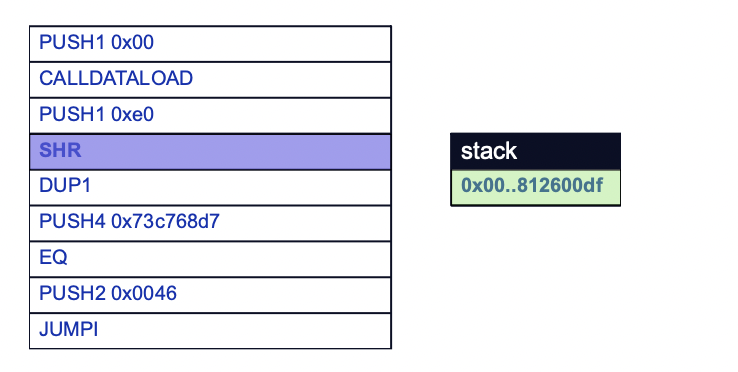 这是通过首先用PUSH1将0xE0推送到堆栈上,然后通过SHR向右移位来完成的。移位后,偏移量将被弹出,留下干净的函数选择器作为堆栈的唯一元素:
