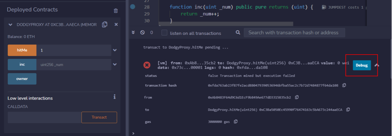 从攻击者的账户中,调用参数为1uint的hitMe()函数,并对失败的交易进行调试: